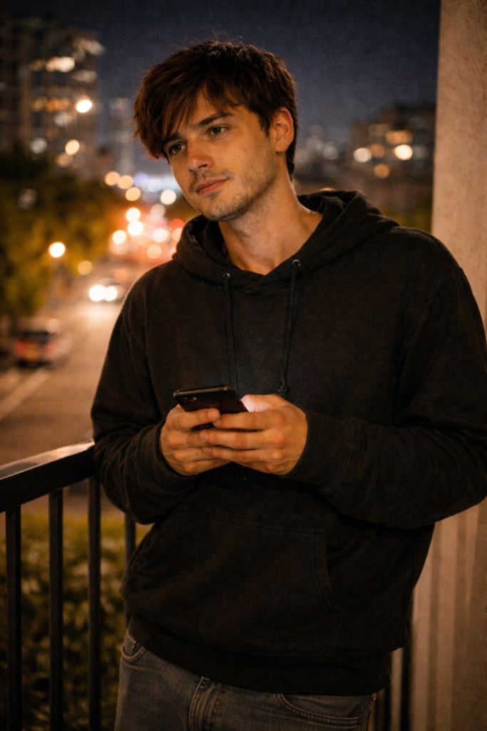 A young person standing on a balcony at night,