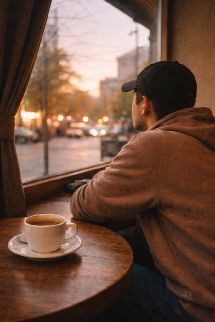 A person sitting alone in a small café during evening hours,